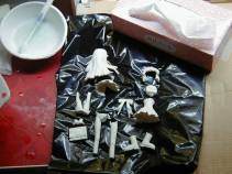 レジンフィギュアは型から外れ易くする為に剥離剤が付いているので、これを落とす必要があります。剥離剤がついたまま作業すると塗料が剥げたり接着が取れて大変悲しい思いをする事になるので、たとえ「手抜きコース」で行くとしても、これだけは念入りにやっておく必要があります。