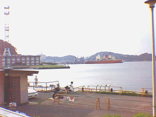 海自の基地の方に目をやると、オレンジ色の見なれない船が停泊中。